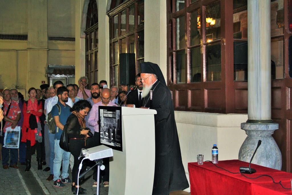 Στη συνέχεια, χαιρετισμό απηύθυνε ο Α.Θ.Π Οικουμενικός Πατριάρχης κ. κ. Βαρθολομαίος, μ’ένα λόγο που εξέπεμπε συγκίνηση και συναισθηματική φόρτιση για όσα συνέβησαν, αλλά και αποφαστικότητα για το μέλλον της Πολίτικης Ρωμιοσύνης, καθώς και της Ίμβρου και της Τενέδου. Κάνοντας αναφορά στις δύσκολες στιγμές που αποτυπώθηκαν στις φωτογραφίες του λευκώματος, ο Πατριάρχης υπενθύμισε πως οι φωτογραφίες δεν μπορούν να συμπυκνώσουν το βάρος της μνήμης όσων βίωσαν τα γεγονότα.