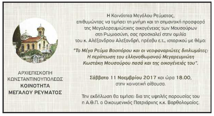 οικογένειας των Μουσούρων στη Ρωμιοσύνη, σας προσκαλεί στην ομιλία του κ. Αλέξανδρου Αλεξανδρή, πρέσβη ε.τ.,